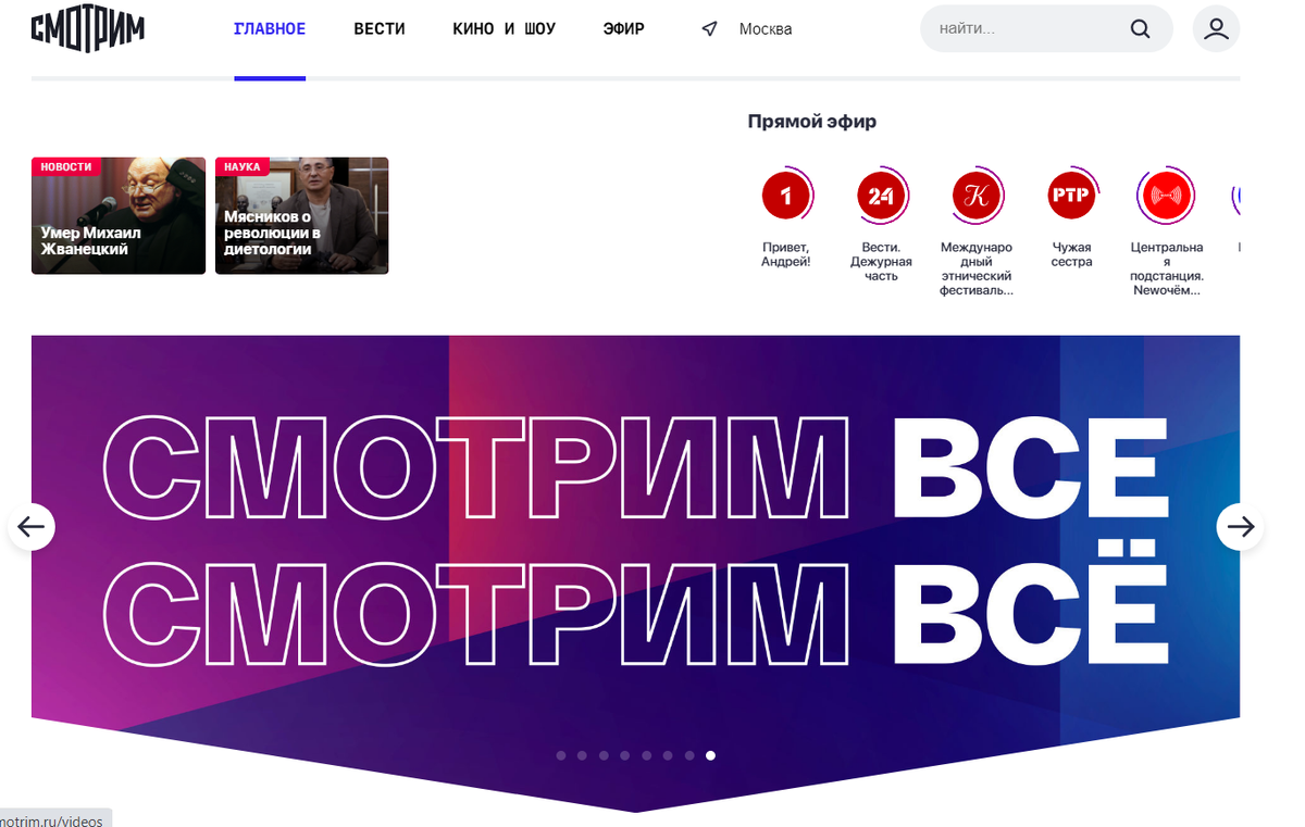 Еще хуже обстоят дела с навигацией. Судя по главной странице "Смотрим", весь его контент делится на две большие группы – «Вести» (то бишь новости) и «Кино и шоу». Видимо, по мнению разработчиков, ничто другое пользователя не интересует. Есть еще одна категория – «Эфир», под которой скрывается… программа передач всех каналов платформы. Правда, чтобы понять, где чья программа, надо хорошо знать логотипы каналов. Сразу перейти на заинтересовавшую программу не получится, можно «выскочить» только на прямую трансляцию.