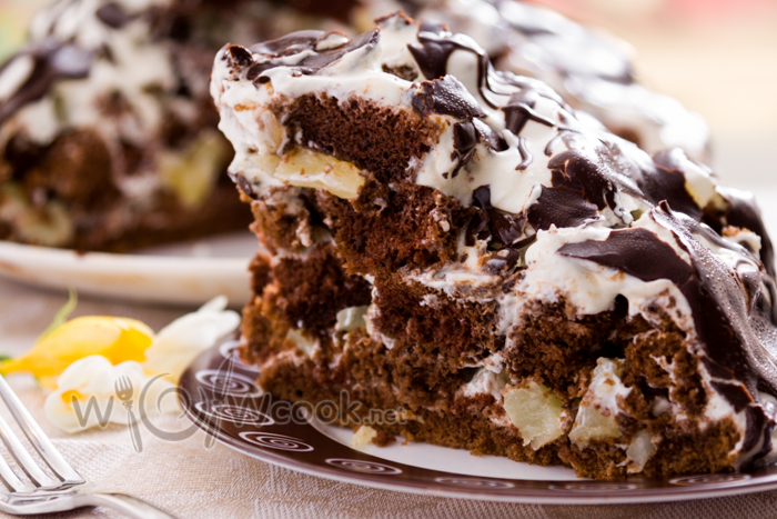 4. В отдельную глубокую посуду перемещаем сметану и всыпаем сахарную пудру. Крем получается очень приятным, жидким и нежирным. Смазываем шоколадный корж сметанным кремом. Ананасы кусочками выкладываем на корж с кремом. Сверху добавляем кубики шоколадного бисквита. Немного поливаем сметанным кремом. Чередуя слои бисквита со сметанным кремом и ананасами, формируем "горку".
