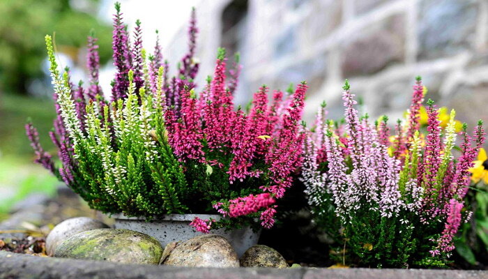 - многолетние растения семейства вересковых. Цветение в июле–августе. Насчитывается около 300 сортов вереска. Цветёт в июле–августе. Предпочитает хорошо освещенные участки. Хорошо растет на сухих, песчаных,кислых торфянистых или же на хвойных почвах . Важно поддерживать внрхний слой почвы во влажном состоянии.Поэтому поливать нужно часто, но умеренно