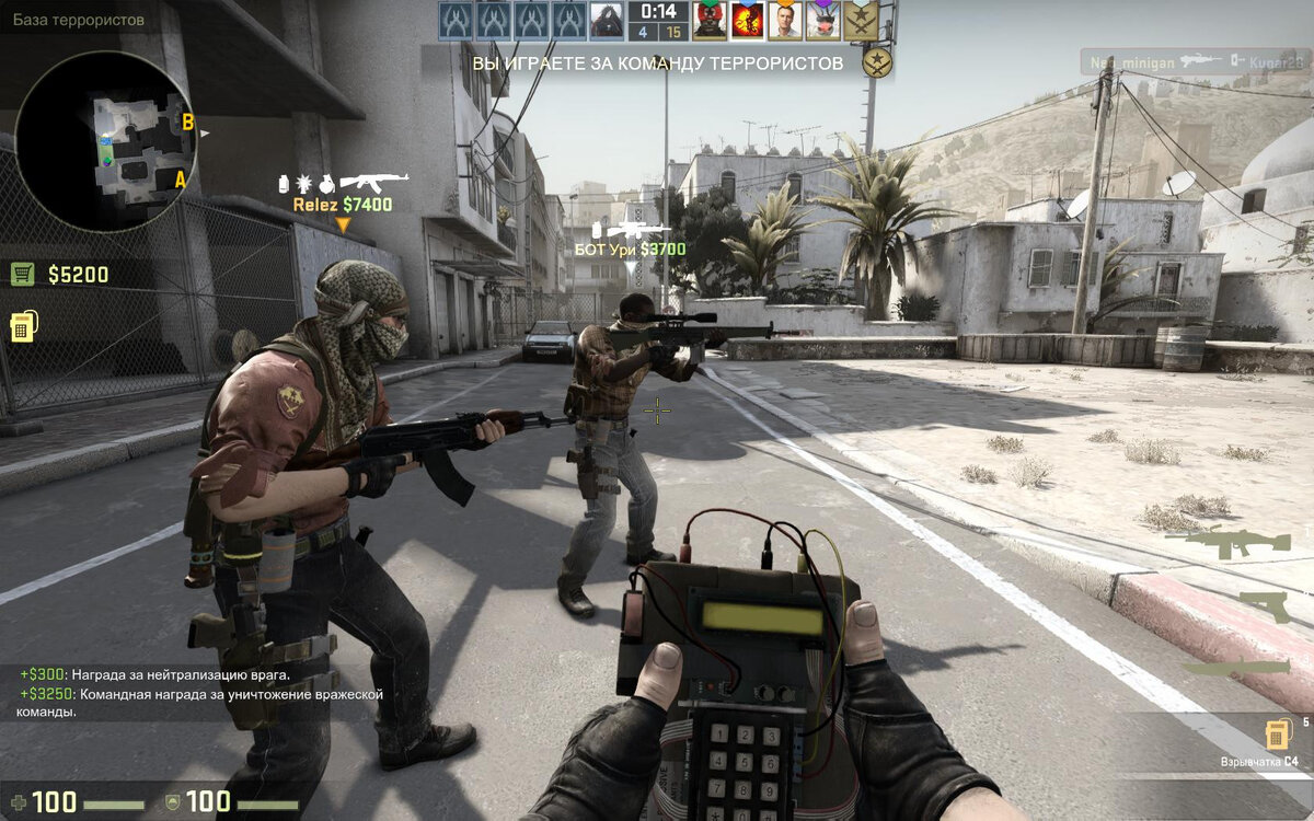 На картах CS: GO с обезвреживанием бомбы (карты, доступные в пуле активных карт), сторона Т диктует игру, так как они должны устанавливать бомбу в течение двух минут. Поскольку сторона КТ, вероятно, будет разделена на группы для защиты каждого плента, действуйте как единое целое для захвата любого из плентов. Может показаться заманчивым ходить везде каждый раунд впятером, все же неплохо будет разделиться на роли, которые мы обсуждали ранее. В результате общая расстановка, которую вы увидите при захвате плентов террористами это 3-1-1: три человека атакуют плент, один человек играет на миду и последний игрок действует в качестве люркера. При атаке ваша экономика решает за вас, что ваша команда способна сделать. Держите это в уме играя как за Т, так и за КТ, поскольку это даст вам примерное представление о том, чего ожидать в каждом раунде игры. Например, представим, что вы играете за Т, и ваша команда сумела выиграть пистолетный раунд, не потеряв никого из команды. Это означает, что каждый игрок вашей команды должна иметь примерно по 3800 долларов, что позволит вам купить автомат и броню. КТ же будут иметь значительно меньше денег,что вынудит их покупать пистолеты или делать эко. Эффективное использование данной информации значительно облегчает атаку и защиту, вы можете по-разному себя позиционировать в зависимости от того, какое оружие противник может себе позволить.