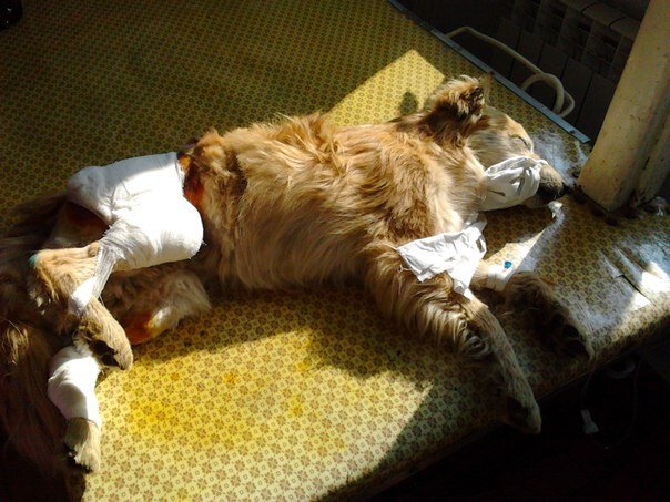 Был прекрасный солнечный день. Я ехала со своей заказчицей на ее машине. При пересечении перекрестка Водопроводная - Чапаева в окне промелькнула сидящая по средине проезжей части перекрестка собака. В неестественной позе, в большой луже крови. Поскольку машина была не моя, за рулем сидел далекий от этой темы человек, прошло еще несколько минут, пока наконец к моей просьбе остановиться и высадить меня отнеслись серьезно. Назад я бежала бегом, сколько было сил, неслась к этому месту, в ужасе от мысли, что за эти мгновения собаку могут переехать еще раз. Как выяснилось в последствии, нанести еще большие травмы было уже наверное маловероятно. Добежав, наконец, до места, увидела стоящую рядом с собакой всю в слезах девушку и мужчину. Я сразу к собаке, гладить, успокаивать, говорить, что все, теперь не пропадешь! Пес весь в крови, лапы вывернуты задние, он ими не владеет, растерян, в шоке, боли видимо еще не чувствует. Но скоро шок начнет проходить.... Медлить нельзя. Кровопотеря большая. Какие то минуты могут стоить малышу жизни. Он такой славный! И с такой надеждой смотрит! Прошу найти хоть какую то тряпку, из которой можно сделать фиксирующую повязку на нос. К огромному счастью, ребята согласились отвезти нас в клинику. Находится кусок простыни. Его хватает и на то, чтобы оторвать подходящий лоскут и застелить сиденье. Фиксирую нос. Малыш доверился. Машину подгоняют ближе, открытой дверцей прямо около него. Крайне осторожно беру его на руки, стараясь не причинить боли и не нанести еще большие травмы. Слава Богу, взяла правильно. Кладу на заднее сиденье, сама с ним рядом. Едем. А дальше нам сказочно везет! На 8 марта есть хирург от Бога, хирург с золотыми руками. Волков Юрий Геннадьевич. Еду и молю всех богов, чтобы он оказался на месте и смог нас принять. Потому что иногда попадаешь на время, когда идет операция и приходится очень долго ждать. А ждать нам нельзя!!! И чудо! Вношу малыша в помещение, а Волков там, склонился над каким то пациентом. Нас сразу же на рентген и я опомниться не успела, как малыш уже лежал под капельницей, его готовили к операции. Нас взяли вне очереди!!! Я и сейчас, когда пишу это, слезы наворачиваются на глаза! Потому что пока мы ехали, малышу становилось все хуже! Он начинал отходить от шока и начинал чувствовать жуткую боль в истерзанном тельце своем. Рентген показал, что одна задняя лапа - открытый ужасный перелом, оттуда и столько крови, вторая лапа - раздроблена кость в районе бедра и в добавок сломан таз. Последнее выяснилось уже в ходе операции. Малыша забрали на стол. Я сижу, меня тихо трясет. Пытаюсь прийти в себя. А девушка, на машине которой мы доехали, рассказывает мне все, как было. Все произошло на ее глазах. От того и столько слез было на ее лице. А случилось буквально следующее. Ехала машина с модными номерами. Неслась на большой скорости. Под колеса попала собака. Визг, крик, машина встала. Водитель вышел посмотреть, что там. Собака бъется у него под днищем, между колесами. И увидев это "препятствие", водитель сел обратно в машину и поехал!!!!! Он намеренно переехал уже раздавленное животное еще раз, теперь уже задними колесами! Комментировать это я не берусь. У меня слов нет таких, которые могут выразить все отвращение к этому мерзавцу и всю ненависть.
