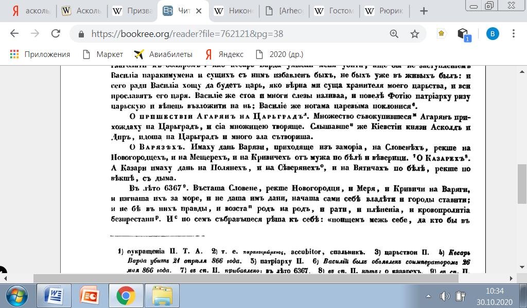 Князья Аскольд и Дир, которые по ПВЛ были «рюриковыми боярами», по Никоновской летописи ещё до «призвания» варягов напали на Византию (860 – 861 гг.), причём Аскольд был назван летописцем «русским князем». Из этого следует, что слово «русь» было известно ещё до прихода варягов. И относилось оно к тем, кто ни к скандинавам, ни к нашествию 862 г. никакого отношения не имеет!