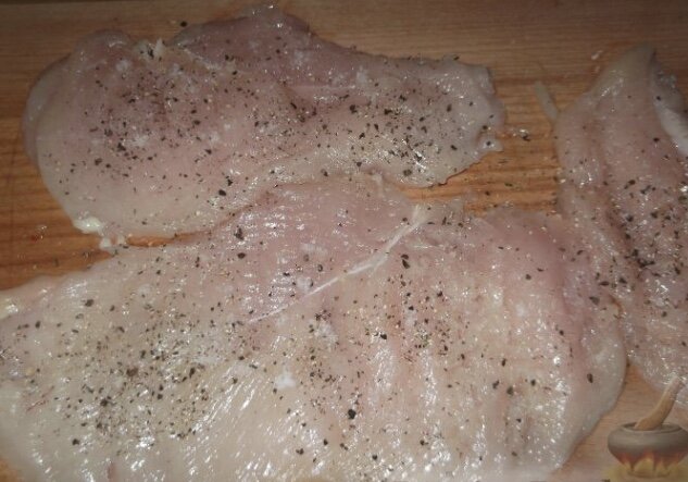 - Куриное филе разрезать вдоль на пласты толщиной 1-1,5 см , слегка отбить с двух сторон , посолить и поперчить