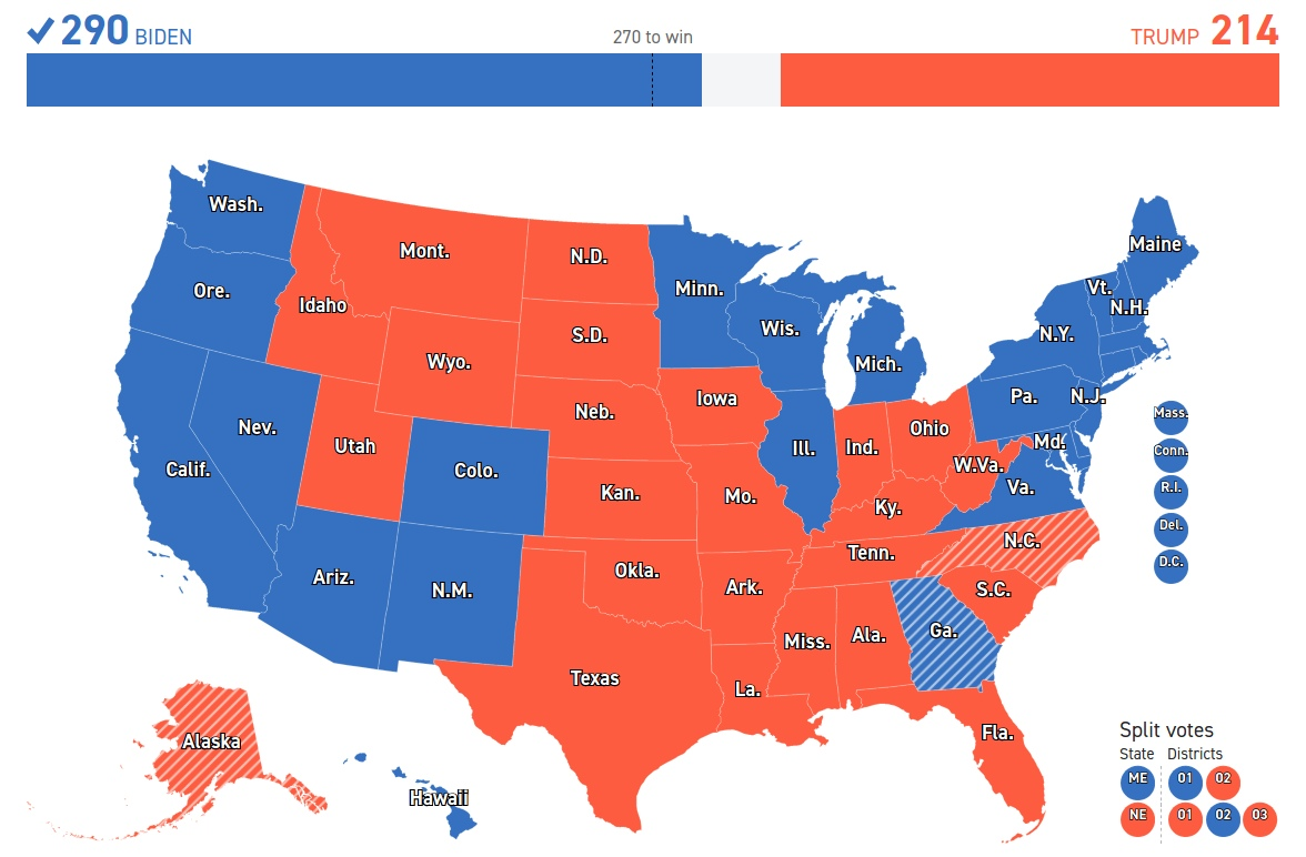 На выборах президента США по итогам голосования побеждает Джо Байден. Теперь всё зависит от пересчёта голосов и судов. Однако в данный момент ещё не досчитаны четыре колеблющихся штата: Невада, Аризона, Северная Каролина и Джорджия. В последних разрыв минимален. Также не досчитана Аляска, что не так важно.