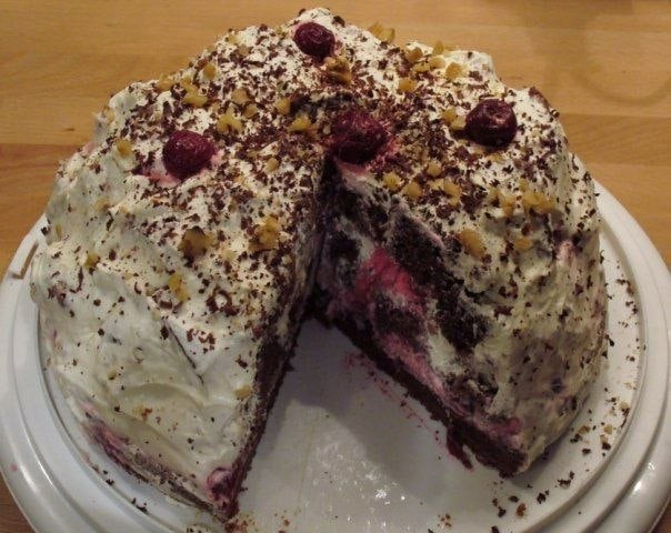 Выложить вишни, размороженные, заранее замаринованные в 2 ст.л. водки и присыпанные сахаром, и порубленные орехи. Каждый кусочек теста обмакивать в крем и выкладывать на торт. Затем опять вишни, орехи и кусочки теста – сложить так тортик. Покрыть торт сметанным кремом. Растопить шоколад на водяной бане и нанести рисунок. Или можно просто посыпать сверху тёртым шоколадом, украсить орехами и вишенками.