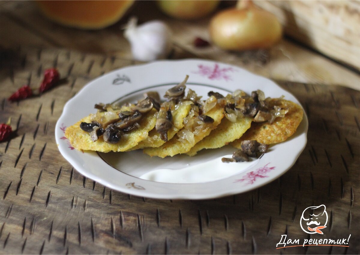 Драники из картофеля и тыквы станут прекрасным вариантом закуски к праздничному столу или домашнему ужину. Блюдо подают с грибной обжаркой и нежной сметаной. Шампиньоны отлично раскрывают вкус тыквы и жареного картофеля. Если вы хотите сделать драники более сытными, в картофельное тесто можно добавить куриный фарш мелкого помола. Обязательно добавляйте в блюдо лук и чеснок - они придают драникам пикантный аромат и тонкий пряный вкус.