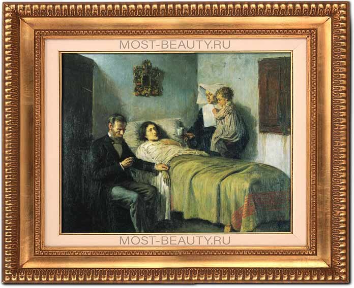Картина написана в стиле реализма. У постели больной женщины сидит доктор. Рядом стоит монахиня-она взяла заботу о ребенке больной женщины. Эта картина, работа была отмечена почетной золотой медалью на разных выставках.