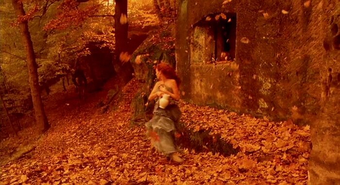 Потрясающая визуальная сторона фильма: красивый золотой лес с непрерывно сыплющимися листьями и полуголая лесная нимфа у водопада;