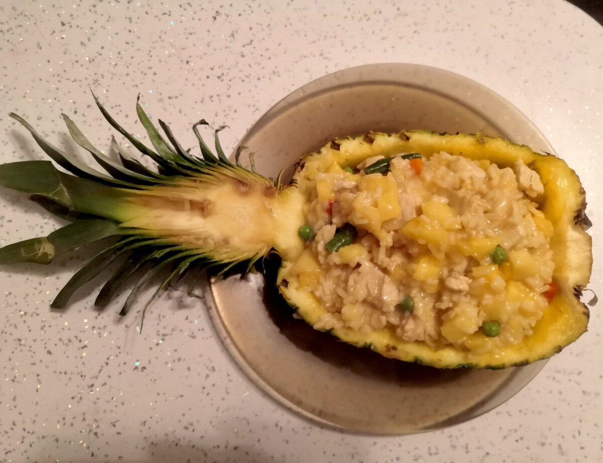 - разрезаем ананас на две части и удаляем мякоть, ее оставляем для начинки