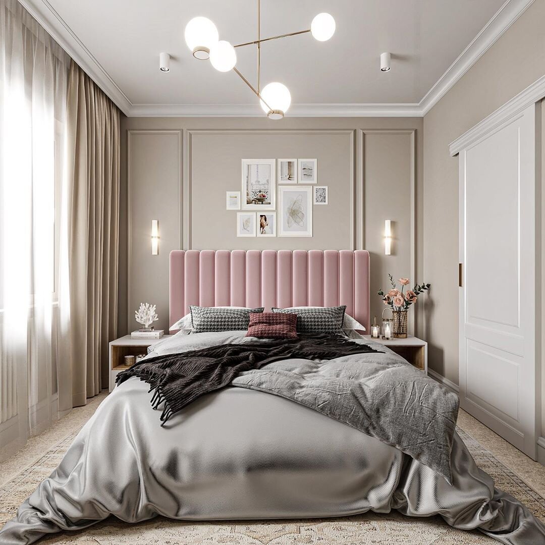 Классика и неоклассика из моды уходить не спешат. Строгие формы в сочетании с пастельными тонами всегда выглядят невероятно и при этом уютно. Также уюта добавляет большое мягкое изголовье с линейным узором.