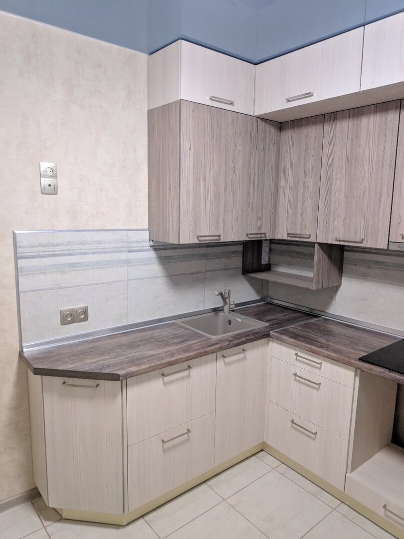 Здравствуйте, дорогие читатели и гости моего канала! Ремонт - это всегда хорошо. В любом случае это обновление пространства, более удобна мебель и ощущение нового этапа в жизни. Но далеко не всегда новый ремонт оказывается таким, каким мы его представляем у себя в голове. Вчера я наткнулась на фотографии кухонного гарнитура в хрущёвской кухне, который сын-мебельщик сделал для своей матери. Уж не знаю, самостоятельно он спланировал его дизайн или мама принимала участие, но мне бы хотелось подробнее остановиться на дизайне этой кухне и обсудить с вами все плюсы и минусы итогового результата. По цвету гарнитур сделали под дерево, с сочетанием светлых и тёмных тонов. Кухня получилась многоуровневая, что одновременно очень практично на маленьком пространстве, но и выглядит более увесисто и громоздко. Столешницу также сделали под дерево, а фартук выложили плиткой, которая, на мой взгляд, совсем не подходит под стиль кухни. Угол нижней части гарнитура сделали