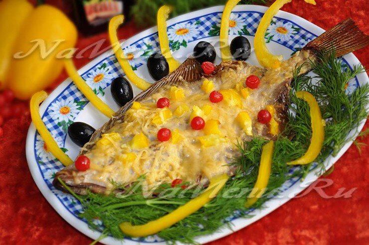 🍽Затем выкладываем рыбу на блюдо. С одной стороны украшаем веточками укропа, с другой - болгарским перцем и маслинами. Ягоды калины выкладываем на рыбу сверху