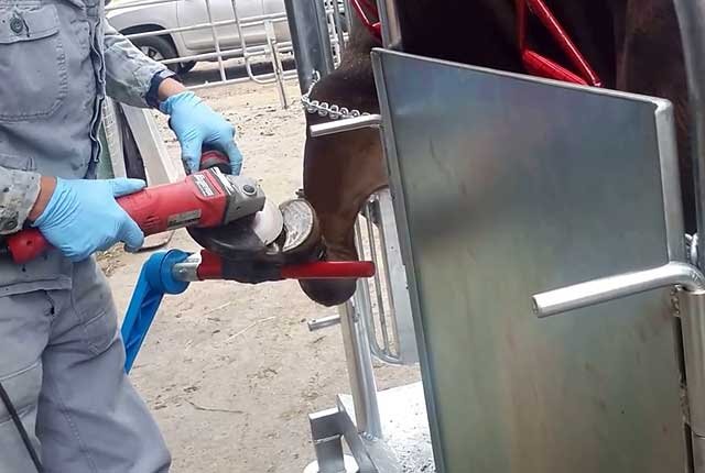 Плотно закрепленные конечности коровы предварительно расчищают от грязи, и только затем оператор проводит срезку старой роговой поверхности до появления ткани белого цвета.