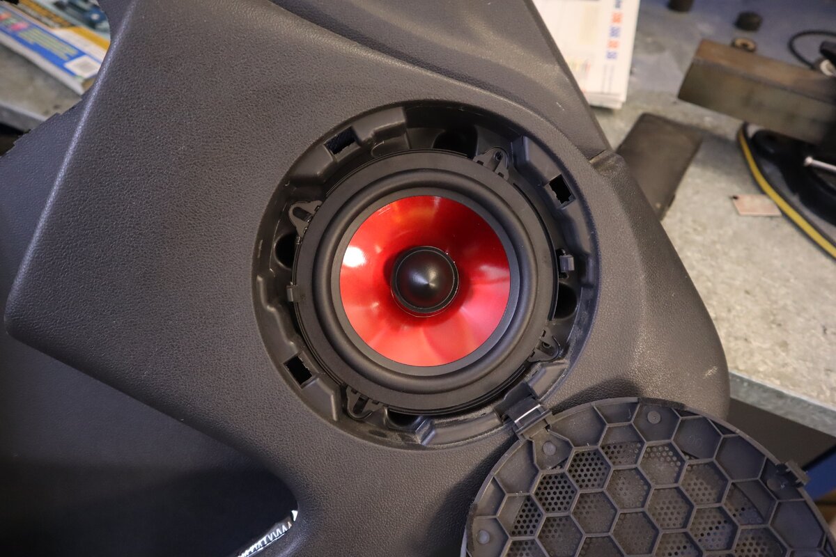 Михалыч снял дверную карту, вырезал отверстие под твиттер, закрепил его. Так же приклеил мягким материалом кроссовер. Аттенюатор кроссовера оставили в положении 0db (можно ещё было выбрать -3db).