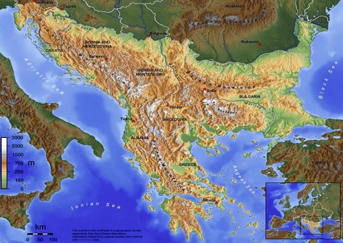 Третья часть полуострова покрыта горными массивами. Хребты делят берег на две части: восточную и западную. Самая высокая гора находится в Болгарии. Высота составляет 2925 м над уровнем моря. Южная часть усеяна равнинами и долинами, между горами и вдоль побережья, которое имеет изрезанную структуру и переполнено фьордами, бухтами и заливами.