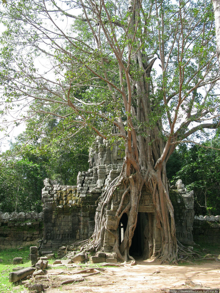 Заканчивали мы не самую большую прогулку по Ангкор-Тому северной его частью - храмом Пре Кан, или Священный меч, построенным в честь победы над тямами, и небольшими храмами Та Сом, библиотека которого оплетена фикусами, и уютным Ник Пином, прасат которого стоит посреди круглого бассейна.Сам Пре Кан так же сильно порос деревьями, как Та Пром,