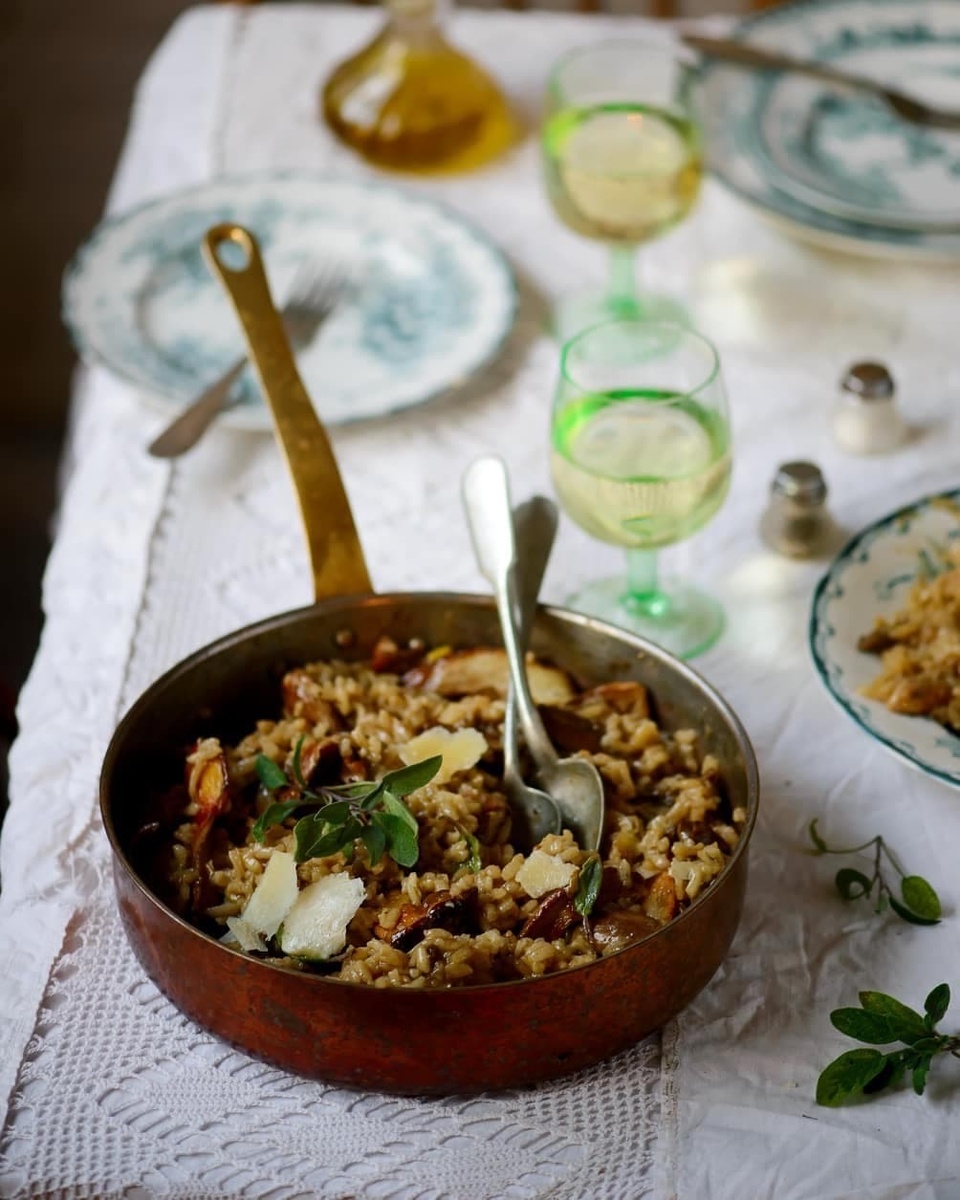 4. Влить вино и дать ему выпариться. Доливать в рис горячий грибной бульон по половнику после впитывания предыдущей порции, периодически помешивая. Когда рис станет мягким и кремообразным, всыпать половину пармезана, натертого на мелкой терке и перемешать.