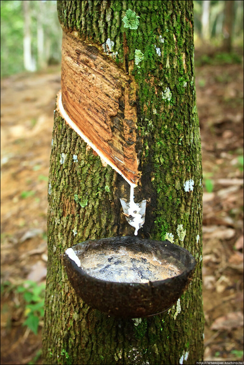 Для получения сырья, фермеры делают специальные неглубокие надрезы на коре, и в заблаговременно подставленную плошку начинает медленно сочиться белый резиновый мед. Как и многие другие культуры на Суматре, эти деревья были завезены колонизаторами, и до сих пор щедро подпитывают суматранский экспорт своим жирным белым соком.