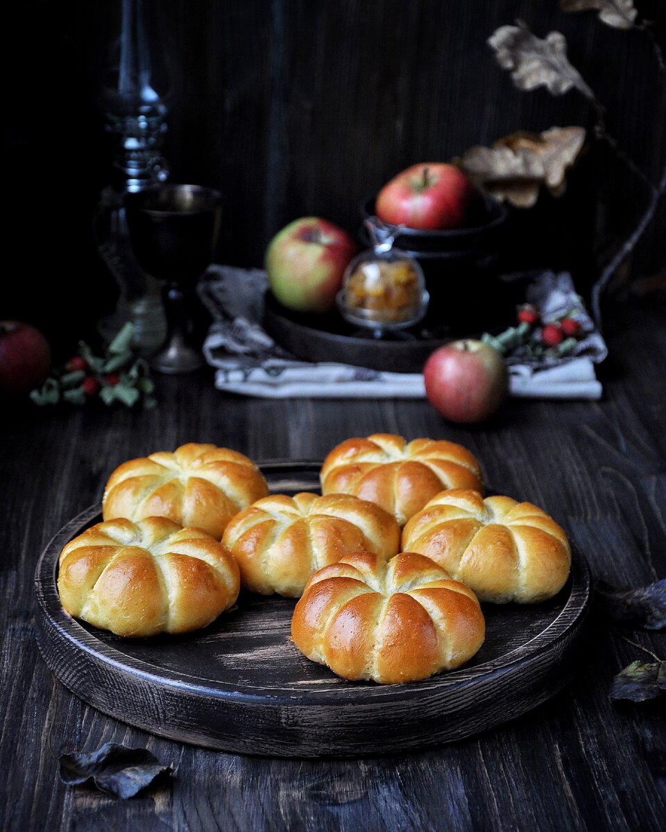 У американцев настоящий культ тыкв и увидев похожую картинку не смогла пройти мимо, хотя там было печенье в виде тыкв, а я решилась на пирожки с добавлением тыквенного пюре для цвета с начинкой из яблок и изюма.