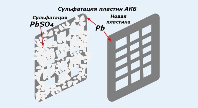 Хоть процесс сульфатации и является неотъемлемой частью работы АКБ, это не значит, что он благоприятно сказывается на аккумуляторе. Если в первый момент, еще у нового АКБ, электроды покрыты тонкой, проницаемой пленкой, практически не влияющей на работу батареи, то по мере ее разряда толщина пленки увеличивается. Поверхность пластин покрывается кристаллами сульфата свинца, не растворяющимися в электролите.