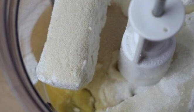 - В чашу блендера выкладываем творог , манку, яйца, сахар и ванилин