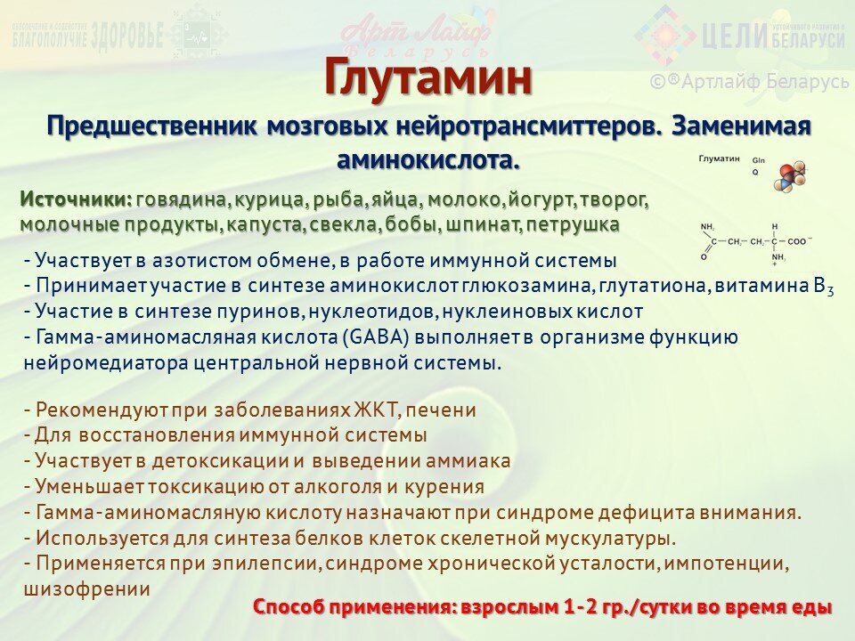 - Глютамин улучшает деятельность мозга и поэтому применяется при эпилепсии, синдроме хронической усталости, импотенции, шизофрении