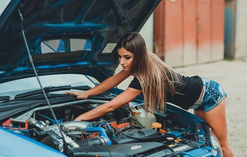Проезжает как то в городском центре автомобиль спортивный, а на водительском сиденье девушка сидит молоденькая. Тут под капотом начинает дым пробиваться. Автомобиль заглох, остановился, девка паникует.