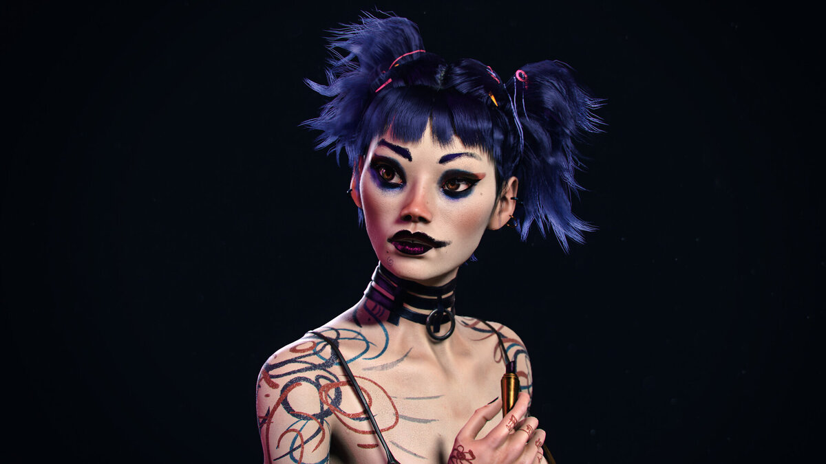 Основная задача заключалась в том, чтобы получить своего рода сходство и попытаться по-своему интерпретировать такой уникальный стиль более “реалистичным” способом, не жертвуя деталями, которые делают данный дизайн таким удивительным. Скульптинг, текстурирование и рендеринг лица были весьма сложными и в некоторой степени утомительными. Кроме того, это была самая сложная прическа, которую я делал при помощи haircards, но я уже не могу дождаться, чтобы опять приступить к созданию чего-то подобного! Я многому научился, работая над этим персонажем, и думаю, что мой рабочий процесс также стал более эффективным, мне удалось сделать это чуть менее чем за 4 недели.