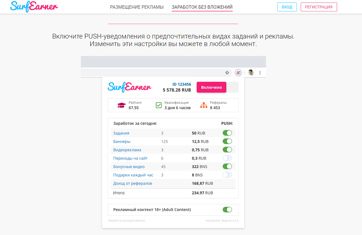 - Наверное, самый «ленивый» способ получить деньги - это установить автоматическое расширение для браузера, например, Surfearner. Такой способ называют еще пассивным, потому что возможность заработать заключается в простом просмотре рекламы. Сидите в Интернете, читайте статьи, просматривайте видео и получайте при этом деньги. Выглядит это примерно так, за каждую рекламу платят от 1 копейки до нескольких рублей. Все зависит от того просто вы смотрите или решили выполнить задание предложенное рекламодателями, здесь можно получить до нескольких сотен рублей. Это может быть установка приложения, знакомство с видео и т.д. Здесь 10-уровневая система поощрений и проценты при внесении рекламодателями дополнительных средств.