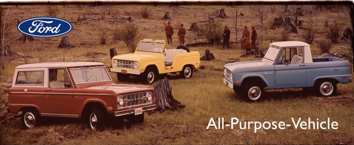 За появление Бронко были ответственны те же самые люди, что и за появление Мустанга. Форд позиционировал как машину на все случаи жизни,поэтому сразу продемонстрировал сразу 3 типа кузова: пикап, универсал и родстер.