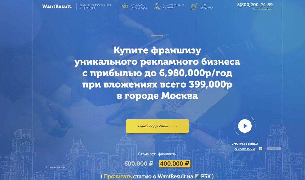 WantResult – очередной лохотрон, пытающийся выставить себя перспективной и прибыльной компанией, у которой обязательно нужно купить франшизу.