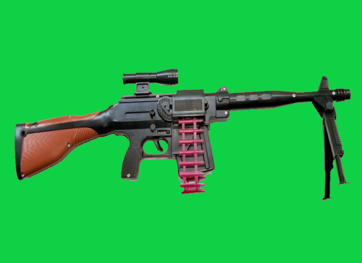 Начнем со ствола, который украшает обложку этого материала. То ли снайперская винтовка, то ли пулемет на сошках. При нажатии на курок оружие издавала тарахтящий звук и проворачивала эту пластиковую пулеметную ленту по кругу...