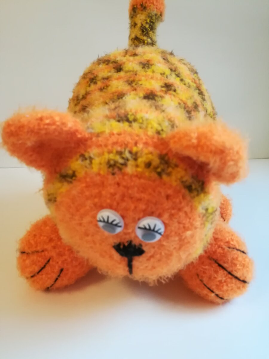 Пряжа камтекс. Фантазийная. Мягкая, приятная. Ушло 4 клубка. 2 оранжевых и 2 меланж. Описание нашла на просторах интернета. Мои дети смеются, что это не кот. Я большой полосатый шмель.
