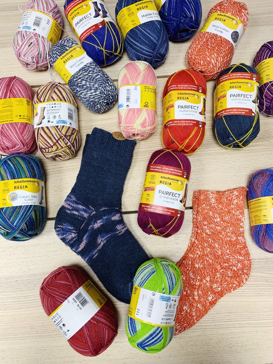 Для вязания носочков потребуется моточек пряжи, а также спицы 2-3 мм, можно использовать круговые спиц (вязать два носка одновременно способом magic Loop), чулочные спицы (5 спиц в наборе, вязание по одному носку), а также три гибкие чулочные спицы Addi Crazy Trio. Количество петель, которое следует набирать зависит от вашей плотности вязания, но, как правило, набрать на взрослые носки можно 56-60 петель, на детские – 36-40 петель. Перед вязанием из пряжи Regia нужно найти определенные секции, чтобы носочки были одинаковые.