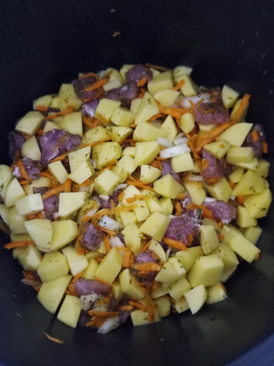 Режем все ингредиенты кубиками среднего размера. Кладём в чашу мультиварки, Наливаем столовую ложку масла, добавляем соль и специи, перемешиваем. Наливаем 150 мл чистой воды.