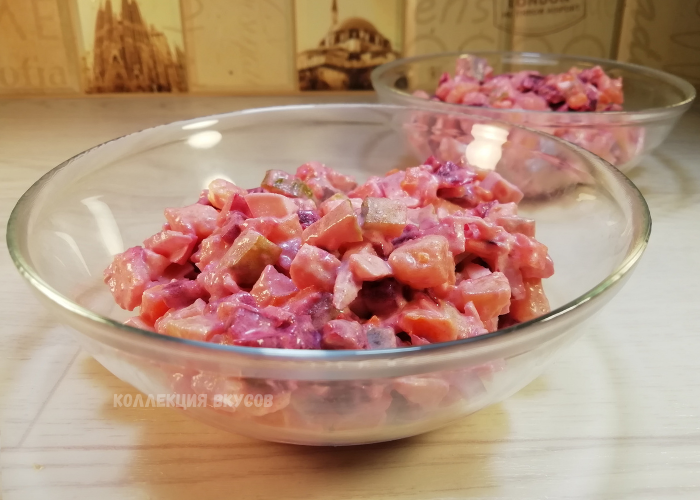 Пока маринуется лук, занимаюсь другими ингредиентами. Нарезаю кубиками запеченную свеклу, отваренную морковь и мариованные огурцы.