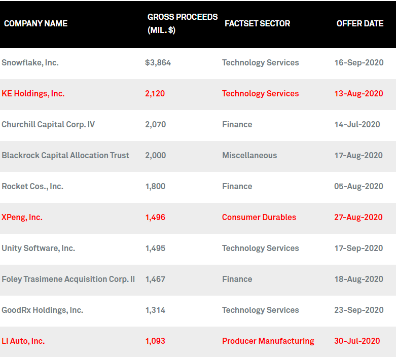 До сих пор в этом году 29 китайских компаний провели IPO на американских фондовых биржах; это включает в себя восемь компаний, которые стали публичными в 3-м квартале. Интересно, что из 10 мега-IPO в третьем квартале три пришли из Китая, они выделены красным: