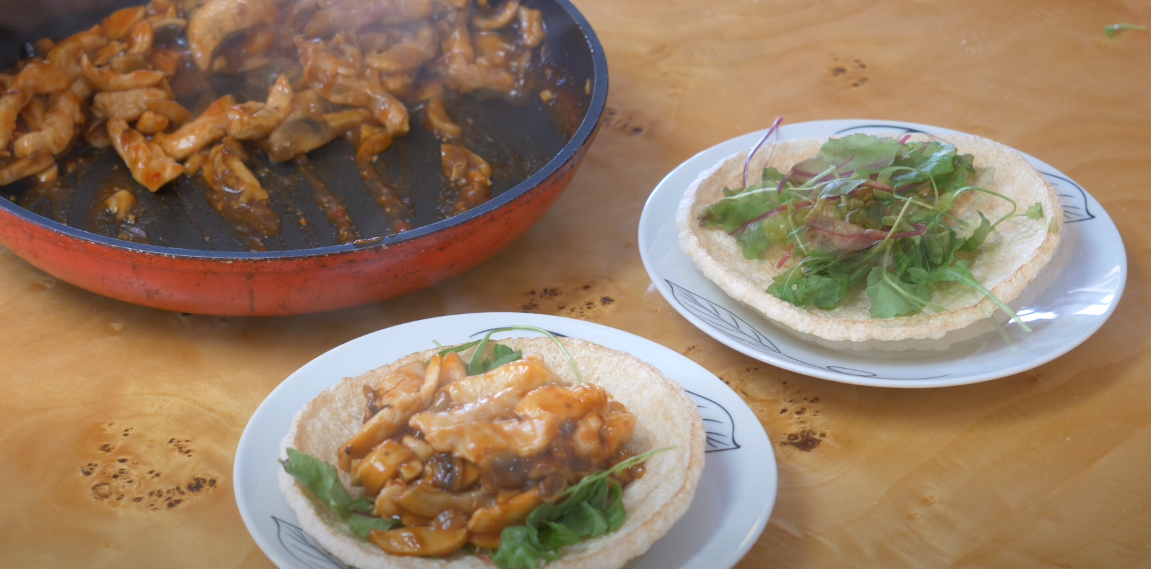 4. На тарелку кладём хлебцы, на них зелень, можно выложить лист салата и помидорки черри, после чего выкладываем нашу грудку с грибочками и подаём на стол.
