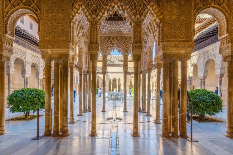 Строения Альгамбры размещены вокруг двух взаимно перпендикулярных дворов. Лучший из них – Львиный двор, окружённый беломраморной аркадой и украшенный фонтаном с фигурами львов. Самыми пышными являются Зал Послов, Зал Двух сестёр и Зал Правосудия (Зал Королей).