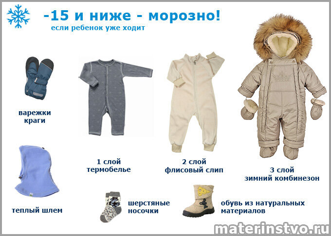 При температуре около нуля (от +5 до -5 градусов) достаточно будет двух слоев: термобелья и зимнего комбинезона. Для такой погоды подойдет демисезонная утепленная обувь (лучше непромокаемая на случай слякоти), надетая на обычный хлопковый носок. На голову ребенку можно надеть флисовую шапку, а на руки – вязаные варежки или перчатки.