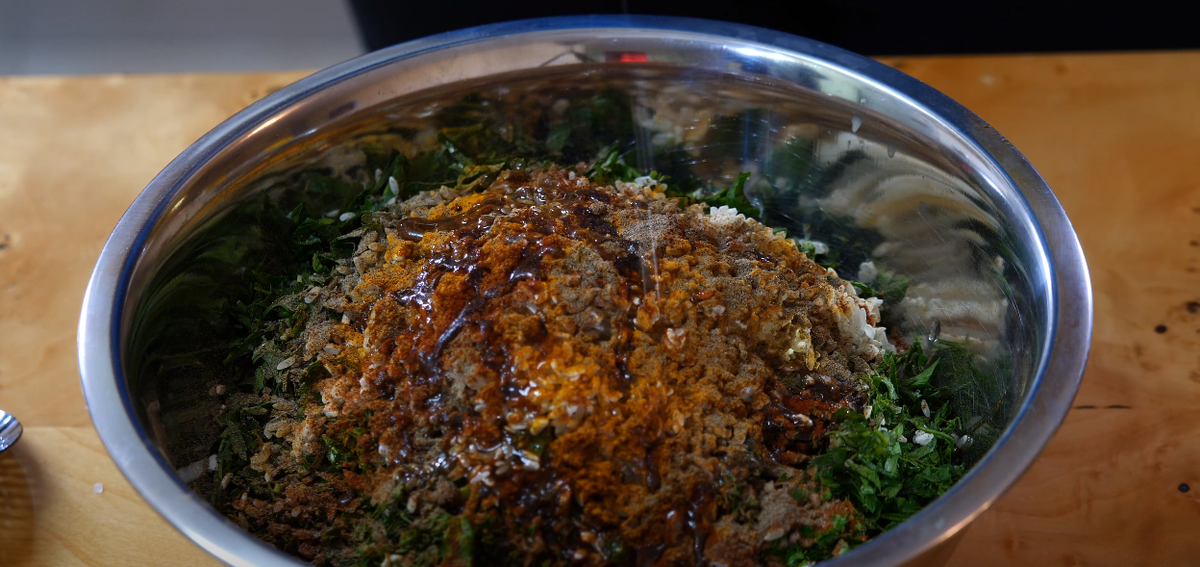 1. Всё вышеперечисленное нарезаем мелкими кубиками, зелень шинкуем помельче и всё это помещаем в 1 тару. Добавляем туда 1 стакан сырого риса, посыпаем крупной солью, добавляем немного паприки и куркумы по вкусу, так же добавляем чёрный перец. Во всю эту смесь добавляем 6 столовых ложек растительного масла. Получаем вот такую красоту и хорошенечко перемешиваем.