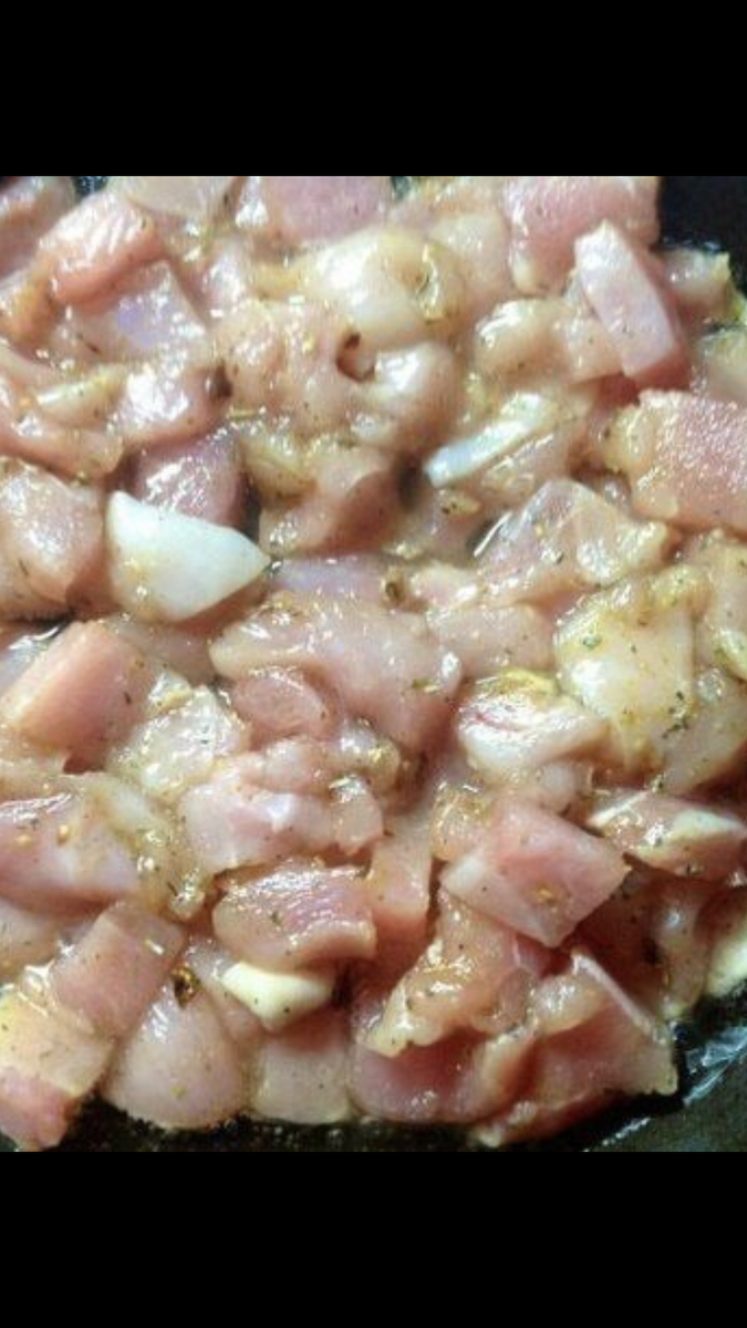 Курицу режем кубиками, добавляем специи, соль и обжариваем на сковороде до золотистой корочки.