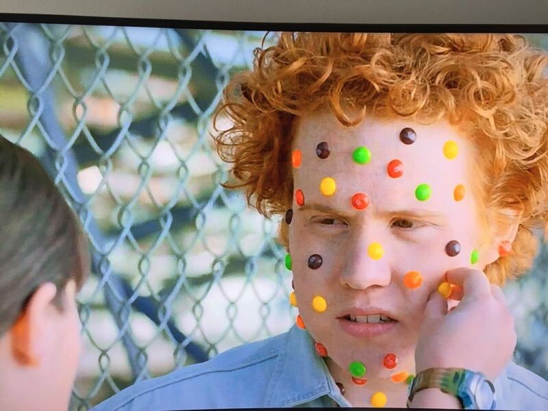И без того не шибко приятной наружности толстый рыжий парень обсыпается какими-то разноцветными пупырышками. Подошедшей девчонке этот тип объясняет, что у него «скитлстрянка».