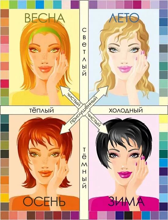 Цветотип – это определенная комбинация цветов и оттенков, цвета волос, глаз, губ и