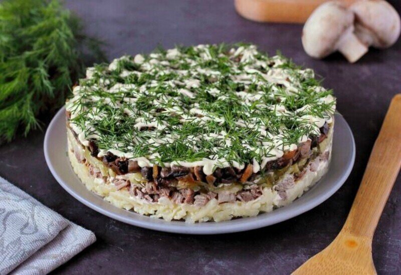 1-й слой: 200 г отварной говядины пропустить через мясорубку, смазать майонезом;