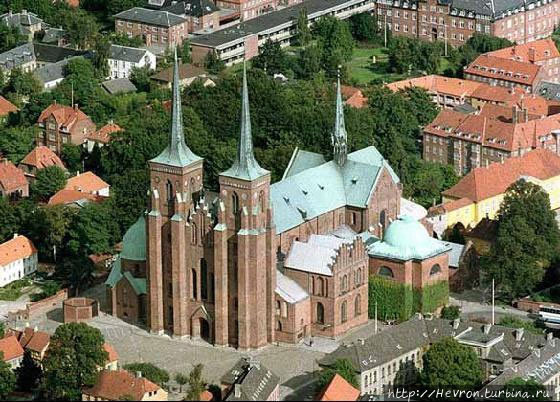 Собор в Роскилле является главным собором Дании, усыпальницей датских королей и объектом всемирного наследия ЮНЕСКО. Первая церковь на этом месте была построена еще в 980 году, она была деревянной, поэтому никаких ее следов найдено не было. Тем не менее, церковь имела огромное значение, раз в ней похоронили Харальда I Синезубого и его сына Свена I Вилобородого. Первая каменная церковь была построена на этом же месте в 1035 году по приказу сестры Кнуда и дочери Свена Вилобородого Эстрид Датской. Ее возвели на деньги, которые ей передал Кнуд за убийство ее мужа ярла Ульфа. В 1080 -х гг. храм освятили, а в 1100 гг. обнесли стеной. Когда мы приехали в Роскилле, с погодой нам не повезло, лил дождь и фото церкви вышли не самые удачные, поэтому вот две из интернета.