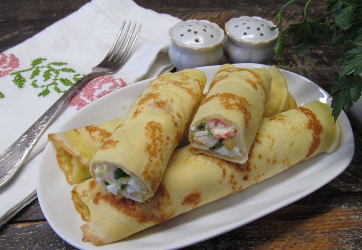 Блины c начинкой из кpабовых палочек с кукурузой Удиви гостей