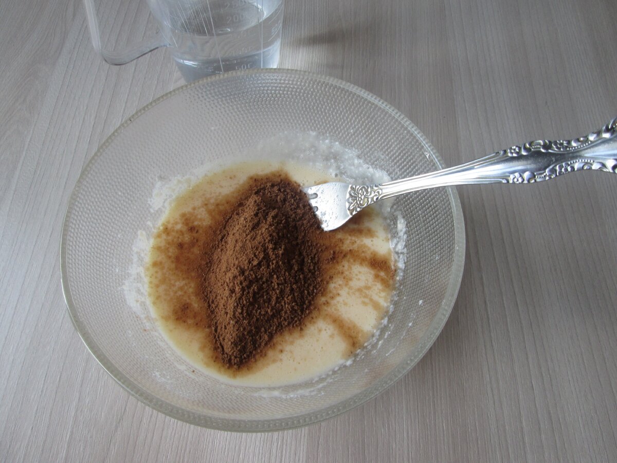 1) Взбиваем яйцо вилкой, добавляем рисовую муку и какао и перемешиваем.
