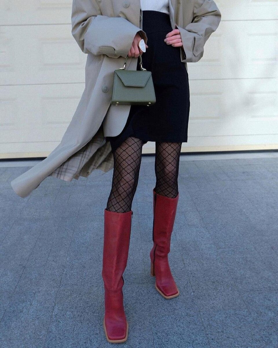 Привлечь внимание к ногам легко: надевайте колготки в мелкую точку с геометрическим узором "ромбы". В сочетании короткой юбкой и удлиненным пальто образ получится соблазнительным, но не вызывающим.