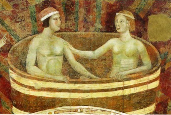 Дело в том, что католическая церковь запрещала любые омовения кроме тех, что происходят во время крещения и перед свадьбой. Считалось, что при погружении в горячую воду, открываются поры, через которые в организм проникает вода, которая потом не найдет выхода. Таким образом тело якобы становится уязвимым для инфекций. А бани - наследники римских терм считались обителью разврата.
